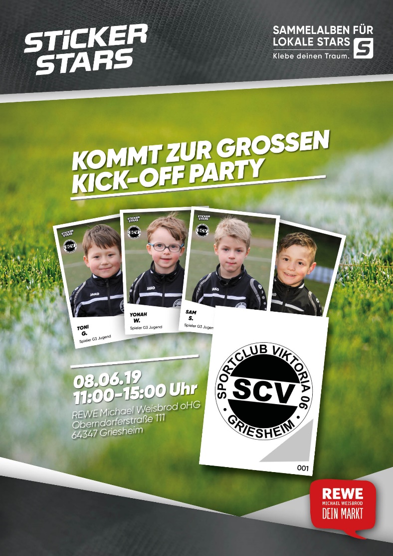 An dieser Stelle gilt ein großer Dank allen Sponsoren, zukünftigen Sammlern und der REWE Michael Weisbrod oHG, bei der das Album und die Sticker bis Mitte August dieses Jahres exklusiv erhältlich sind. Am diesem Samstag von 11 bis 15 Uhr findet das sogenannte Kickoff der Aktion direkt am REWE Markt statt. Neben der Anwesenheit vieler kleiner und großer Kicker, wird gegrillt und für Begeisterte wird ein Torwandschießen angeboten.